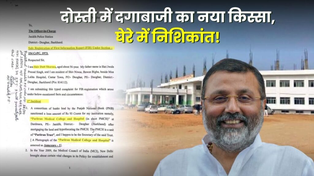 रांची(झारखंड)।दोस्ती में दगाबाजी की कहानी कोई नयी नहीं है,ऐसी कई कहानियां आपके अपने आसपास भी बिखरी नजर आयेगी।कभी किसी दोस्त ने किसी की जमीन हड़प ली तो कभी किसी अजीज दोस्त ने आहिस्ता-आहिस्ता जिंदगी में जहर घोल दी।अब कुछ ऐसी ही कहानी बाबा बैधनाथ ही भूमि देवघर से सामने आ रही है,हालांकि इस कहानी में सच्चाई कितनी और सियासत कितना है,उस बार में दावे के साथ कुछ कहा नहीं जा सकता।जैसे-जैसे मामले की जांच आगे बढ़ेगी, अभी इसकी कई परतें सामने आयेगी,फिलहाल हम बात उस प्राथमिकी की कर रहे हैं, जो बीते 28 मार्चे को जसीडिह थाने में दर्ज की गयी है।●आर्थिक संकट से गुजर रहे थें शिवदत्त शर्मा,मदद का मिला था भरोसा●अपने को गोड्डा से भाजपा सांसद निशिकांत का दोस्त बताने वाले देवघर निवासी शिवदत्त शर्मा ने दावा किया है कि 2009 में मेडिकल काउंसिल ऑफ इंडिया के द्वारा नियमों में बदलाव से वह परित्राण मेडिकल कॉलेज और अस्पताल के संचालन को लेकर आर्थिक संकट से गुजर रहे थें।वर्तमान संसाधनों के साथ उनके लिए मेडिकल काउंसिल ऑफ इंडिया की शर्तों को पूरा करना मुश्किल हो रहा था।उधर बैंक हमारे संस्थान को दिये गये ऋण राशि को एनपीए में शामिल करने की बात कह रहा था, जबकि हमें और भी ऋण की जरुरत थी।निशिकांत दुबे और उनकी पत्नी अनामिका गौतम का घर पर आना जाना लगा रहता था,इसी बीच उनके द्वारा इस बात का भरोसा दिलाया गया कि वह एक आर्थिक रुप से मजबूत पार्टनर की खोज कर देंगे, ताकि बैंक की शर्तों को पूरा किया जाय,जिससे कि मेडिकल काउंसिल ऑफ इंडिया की शर्तों को पूरा किया जाय।इस बीच निशिकांत दुबे के द्वारा हमसे संस्थान की जमीन का दस्तावेज और 25 लाख रुपये की मांग की गयी।रुपया देने के बाद निशिकांत दुबे ने फिर हमसे कोई संपर्क नहीं किया।जबकि हमारी ओर से उनसे बराबर संपर्क साधने की कोशिश की गयी।इस बीच हमारी ओर से बैंक के साथ फ्रेस सेटलमेंट की कोशिश किया जाता रहा।इसी बीच हमें जानकारी मिली कि डीआरटी और पंजाब नेशनल बैंक ने हमारे जमीन और संस्थान की बोली लगा दी है।शिवदत्त शर्मा का आरोप है कि महज 15 हजार से हुई इस ट्रस्ट में देखते देखते करोड़ों का ट्रांजेक्शन होने लगा,इसकी गतिविधियां संदेह के घेरे में है,बावजूद इसके बैधनाथ मेडिकल ट्रस्ट बोली लगाने में सफल रहा और यह सब कुछ हमारे द्वारा सौंपे गये दस्तावेजों के साथ छेड़छाड़ कर कर किया गया।शिवदत्त शर्मा का आरोप है कि इस मामले में निशिकांत दुबे के साथ ही उनकी पत्नी अनामिका गौतम गौतम,देवता कुमार पांडेय,राजवीर कंस्ट्रक्शन,वीर कुमार अग्रवाल,विमल कुमार अग्रवाल,पुनीत कुमार अग्रवाल की भूमिका है।इन लोगों ने ना सिर्फ हमारे संस्थान पर कब्जा किया बल्कि बाबा बैद्यनाथ मेडिकल ट्रस्ट के माध्यम से परित्राण मेडिकल कॉ