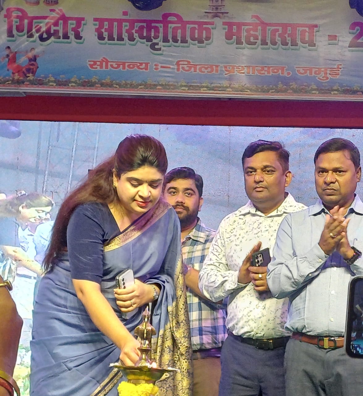 जमुई ब्यूरो।बिहार सरकार,कला संस्कृति एवं युवा विभाग तथा जमुई जिला प्रशासन द्वारा आयोजित दो दिवसीय गिद्धौर सांस्कृतिक महोत्सव का गिद्धौर स्थित कुमार सुरेंद्र सिंह स्टेडियम के मैदान पर आगाज हुआ।जिला पदाधिकारी,जमुई श्रीमति अभिलाषा शर्मा, अपर समाहर्त्ता सुभाष चंद्र मंडल,जिला परिवहन पदाधिकारी मो.इरफान,जिला पंचायती राज पदाधिकारी वीरेंद्र कुमार,उप समाहर्त्ता भूमि सुधार तारिक रज़ा और अनुमंडल पदाधिकारी अभय कुमार तिवारी ने संयुक्त रूप से अग्नि ज्योति जलाकर महोत्सव का शुभारंभ किया।समारोह में जिला स्तरीय पदाधिकारी व प्रखंड स्तरीय पदाधिकारी उपस्थित रहे।उक्त कार्यक्रम में बॉलीवुड गायिका अदिति पॉल एवं उनकी म्यूजिशियन टीम ने विशाल मंच पे संगीत एवं गायन प्रस्तुत किया।कार्यक्रम समाप्त होने के उपरांत जिलाधिकारी ने बॉलीवुड गायिका अदिति पॉल एवं उनके ग्रुप द्वारा प्रस्तुत कार्यक्रम की सराहना की तथा स्मृति चिन्ह भेंट कर सम्मानित किया।